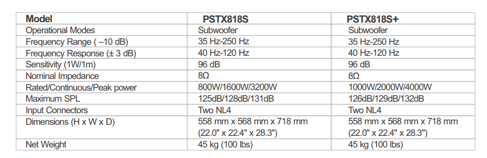 A single 18" compact high power subwoofer system in a front-loaded, vented enclosure designed for minimum frontal area provides 1,000 watts of continuous pink noise power handling, 2 kW program and 4 kW peak. The PSTX818S also comes equipped with a topmounted M20 pole-mount and an optional wheel kit.