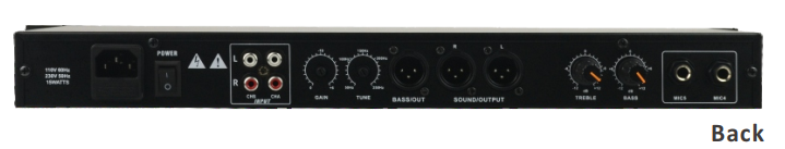 Features: 99 kinds of digital reverberaƟon effectsMusic thrilling effectBuilt-in electronic frequency divider, realizing ultra-low sound audio output (crossover point adjustable)5 microphone inputs2 s
